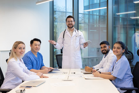 Handsome middle aged man doctor explaining information for his students at the class. Male supervisor doctor smiling while talking to his young multiethnic colleagues at the meeting
