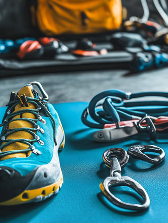 Essential rock climbing gear including shoes and carabiners on a blue mat, ready for an adventure.
