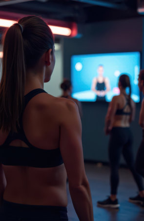 Group of athletic women exercising in a gym watching online fitness class on a big screen, following instructions of personal trainer giving workout session