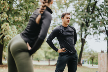 Young couple in sports outfit doing morning workout outdoors in hot summer