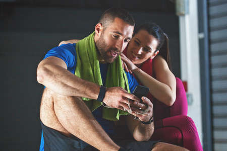 Young athletic smiling woman laughing in the gym, photographed on mobile phone. Fitness, sport, training, people, healthy lifestyle concept