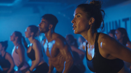 group of athletic young people in sportswear doing push ups or plank at the gym