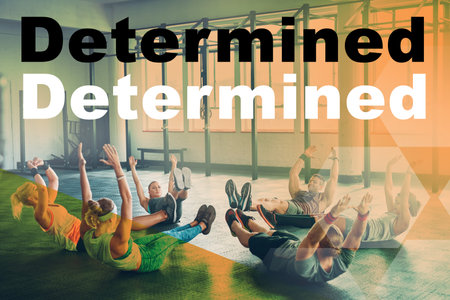 Fitness, overlay and group workout in a gym with a personal trainer for health, wellness and training. Motivational quote, cardio and team of athletes doing floor exercise with coach in sports studio