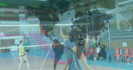 Jumping players hitting volleyball over net in gym, with bleachers, red chairs and sports bags. Athletes, teamwork, fitness, sport, recreational, discipline, vitality