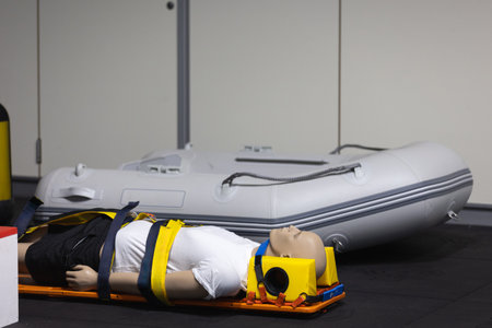 Emergency Medical Simulation, Rescue Mannequin Secured On Stretcher For Training and Inflatable Boat.