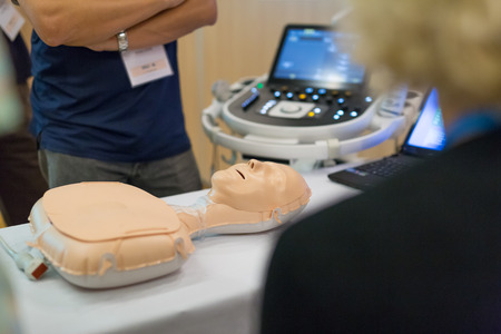 Medical doctor expert instructor displaying method of patient intubation on medical education training and workshop. Participants working in teams learning new medical procedures and techniques.