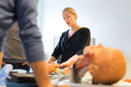 check pulse - CPR First Aid Training with CPR dummy in the class