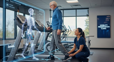 ai assisted rehab with treadmill walking and physical therapy for senior patient in a clinic setting today