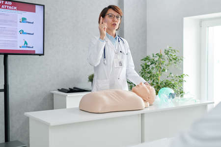 Mature female doctor talking about the rules of first aid using mannequin during medical training