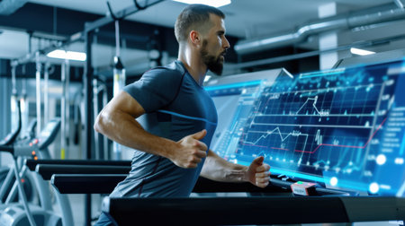 A young man runs on a treadmill in a contemporary gym, interacting with advanced digital fitness metrics and data displays for an enhanced workout experience.