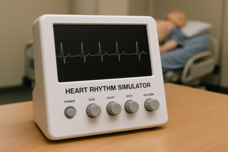 Medical device simulating heart rhythm with normal sinus rhythm displayed on screen, used for educational purposes in healthcare settings with patient lying on bed in background