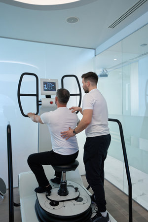 Male undergoing neuromuscular rehabilitation on modern equipment