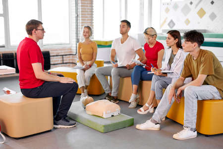 CPR class with male instructor speaking and demonstrating help, giving lessons of first aid. compression and resuscitation procedures. Cpr mannequin is used for an example