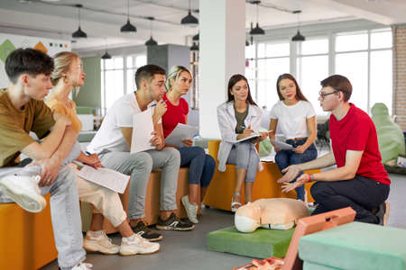 Group of young people learning to make artificial breathing with medical dummies during the first aid training in the white room