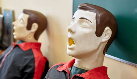 CPR first aid resuscitation adult man life size training dummy model, doll face closeup, detail, mannequin mouth wide open, medical equipment. Paramedic class training simple props abstract concept