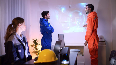 Engineers and industrial workers in safety uniforms discussing a tunnel construction project in a meeting room with site visuals on screen