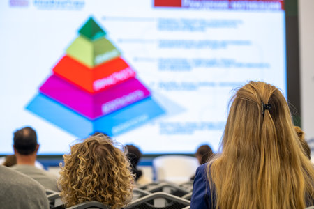 Attentive audience in conference room listening to speaker with microphone; slides projected on screen; attendees take notes or capture moments with devices; professional learning environment