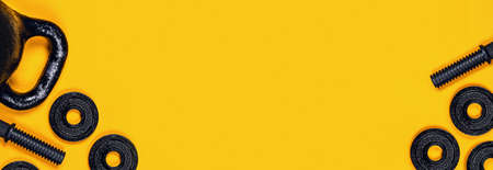 Sports web banner. Kettlebell and dumbbell on yellow background. Flat lay, top view, copy space.