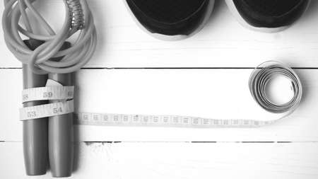 fitness equipment : running shoes,jumping rope and measuring tape on white wood table black and white color tone style