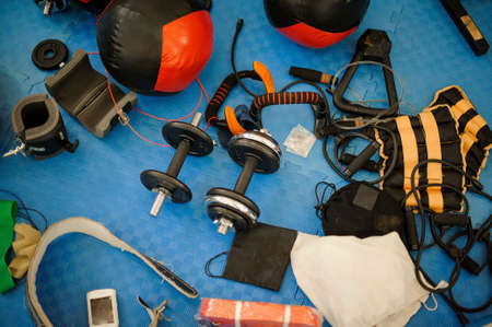Shot of some exercising equipment scattered on the floor, against a blue background