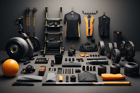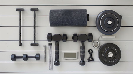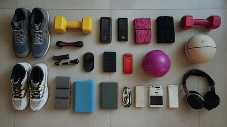 A flat lay of various fitness equipment and accessories showcasing essential items for a home workout routine, promoting a healthy and active lifestyle through exercise.
