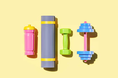 Fitness accessories on a yellow background. sports background. copyspace. top view