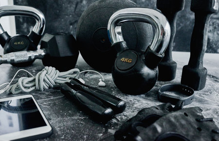 A collection of gym equipment and a notebook with a diagram on it. Scene is focused and determined, as the person using the equipment is likely to be working hard to achieve their fitness goals