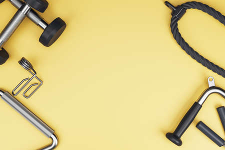 Workout and gym concept with yellow surface with copyspace and sport equipment on the sides. 3D rendering, mock up