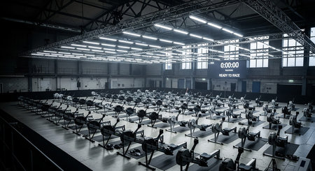 A large indoor gym filled with rows of rowing machines and a digital timer displaying 'READY TO RACE'.