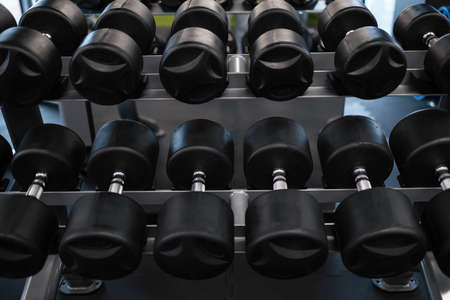 Stand with black steel dumbbells in the gym, fitness center. Concept of sports equipment and tools. Concept of sports and healthy lifestyle