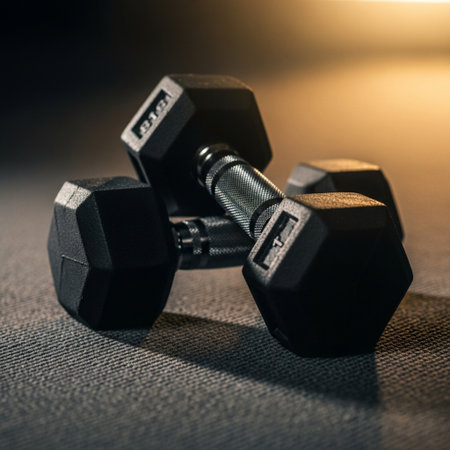 Impeccably organized dumbbells create a sense of anticipation for a powerful workout. The warm sunlight and shadows add a dynamic visual appeal, perfect for fitness brands, health magazines, and personal training promotions.