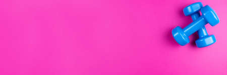 two blue dumbbells on a pink background, photo banner, top view, space for text.