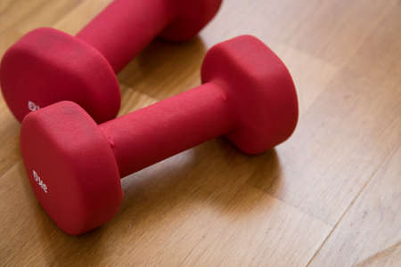 Pair of red 3kg dumbbells on wooden floor for fitness training workout