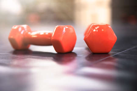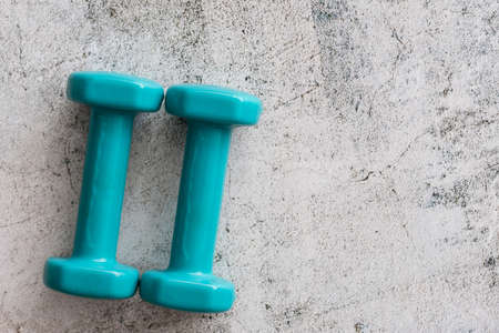Fitness or bodybuilding concept background. Dumbbell exercise weights on the floor