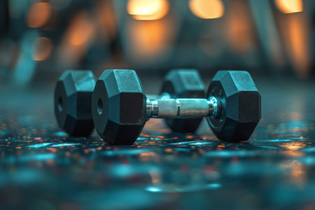 Two black dumbbells are lying on the shiny floor of an empty gym, reflecting in the polished surface, creating a serene and minimalist fitness scene