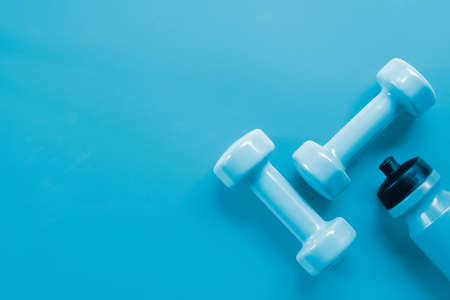Dumbbells and water bottle on blue background. Weight loss, fitness, sport concept. Top view. Copy space.