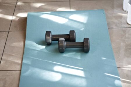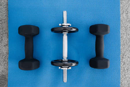 healthy and fit lifestyle concept, home gym equipment on yoga mat including dumbbells and weights