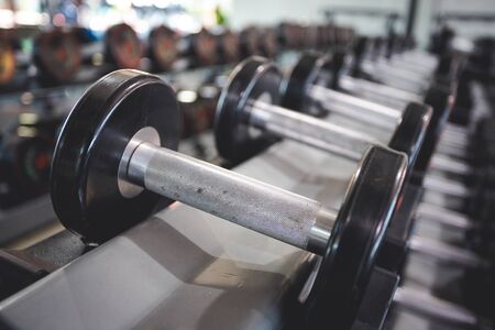 Close-up of many dumbbells stuff for gym.