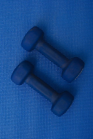 Sports dumbbells flat lay isolated on blue.