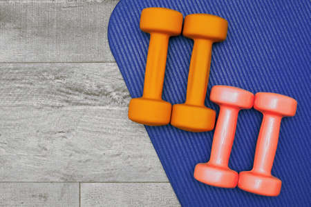 Fitness or exercising at home concept, top view with copy space background