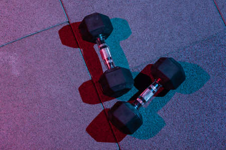 Dumbbells in red-blue gradient light on floor