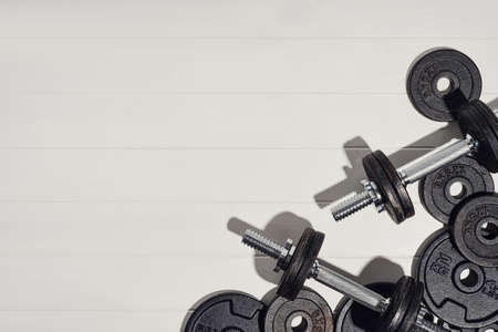 Dumbbells on white background. Fitness, sport and workout concept flat lay. Weights layout