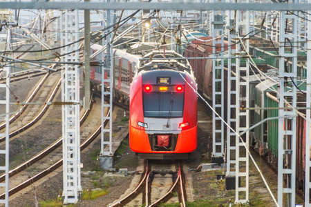 A modern high-speed red train on a section of the Moscow Central Circle Line.
