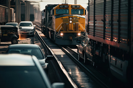 close-up of train engine, with the cars in motion, and cars waiting at crossing, created with generative ai