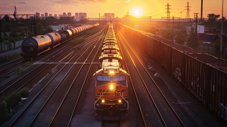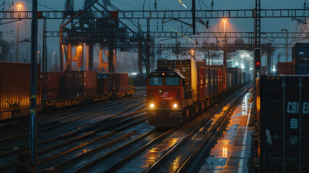 Trains navigate through a bustling urban network as containers are transported between exchanges. The setting showcases the infrastructure supporting trade at twilight.