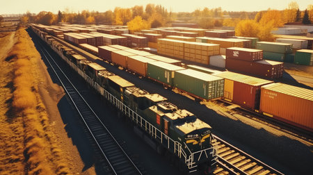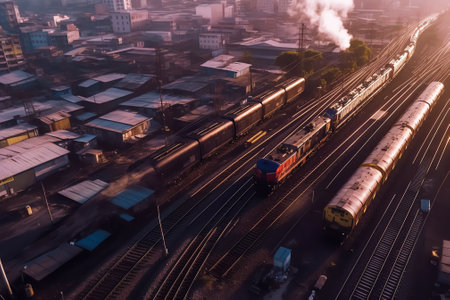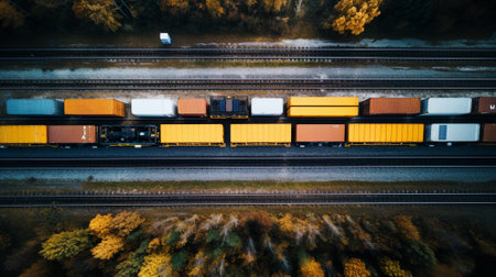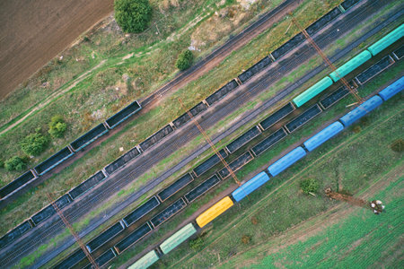 Aerial drone view of a freight train at a railway station, showcasing industrial transport infrastructure with steel tracks and cargo carriages. Ideal for logistics themes.