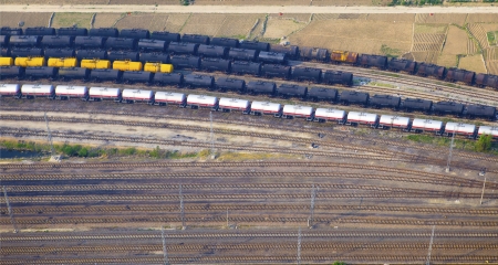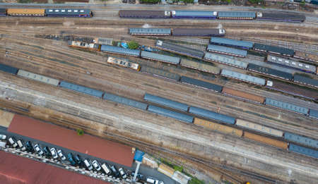 Aerial view of the many-lane railway junction with trains, passengers and freight wagons. Wagon depot.