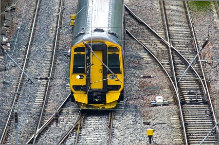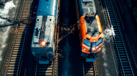 Aerial view directly above high speed passenger trains heading towards a railway junction in a rail accident concept image