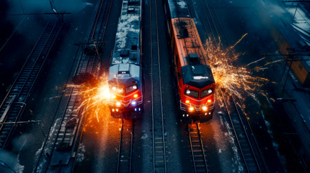 Couple of trains that are sitting on train track with sparks coming out of them. Generative AI.