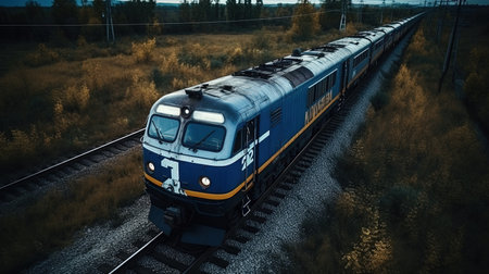 From a bird's eye view, a train snakes through a lush and verdant forest, surrounded by towering trees and a natural landscape. AI Generative AI.